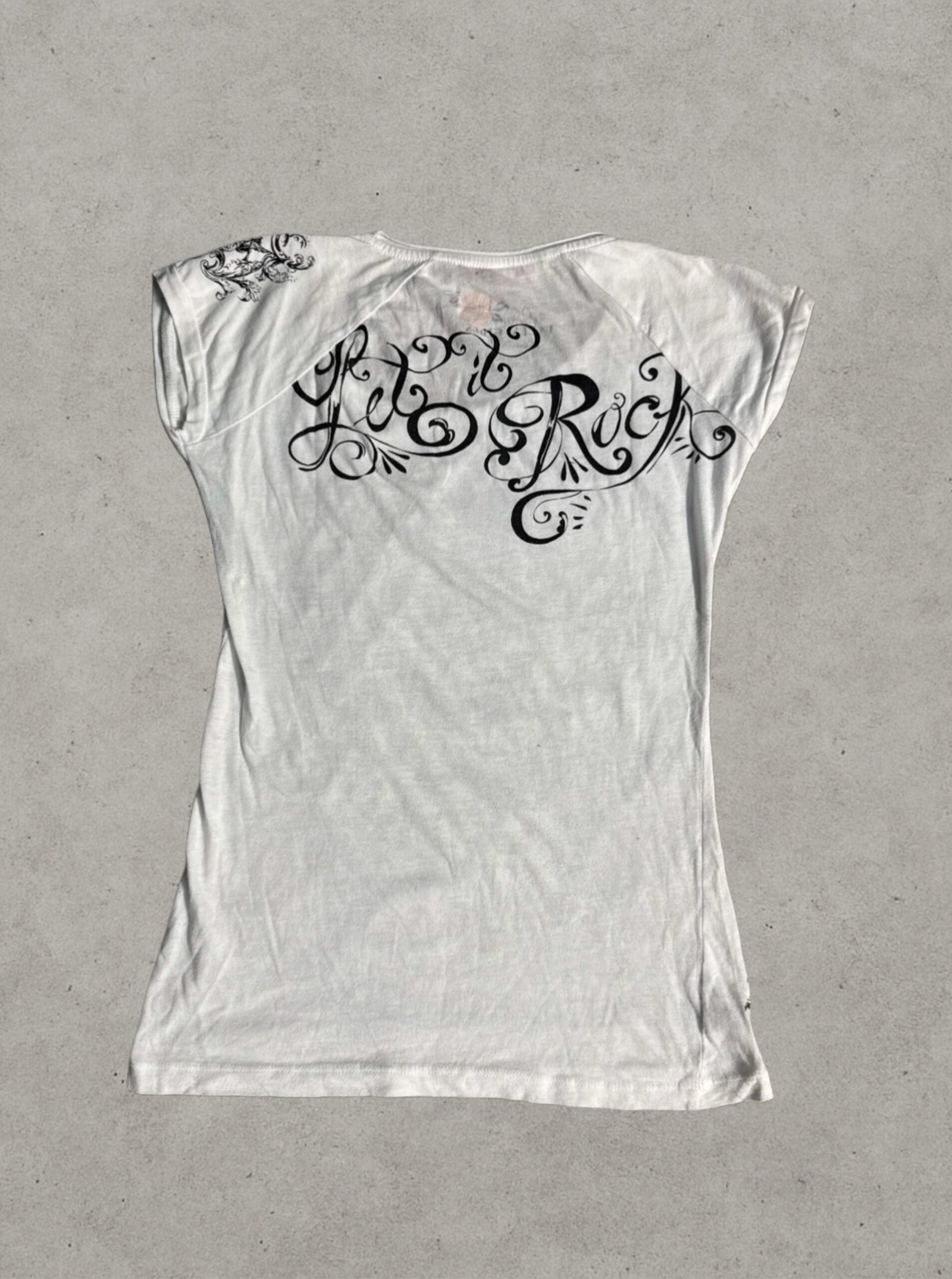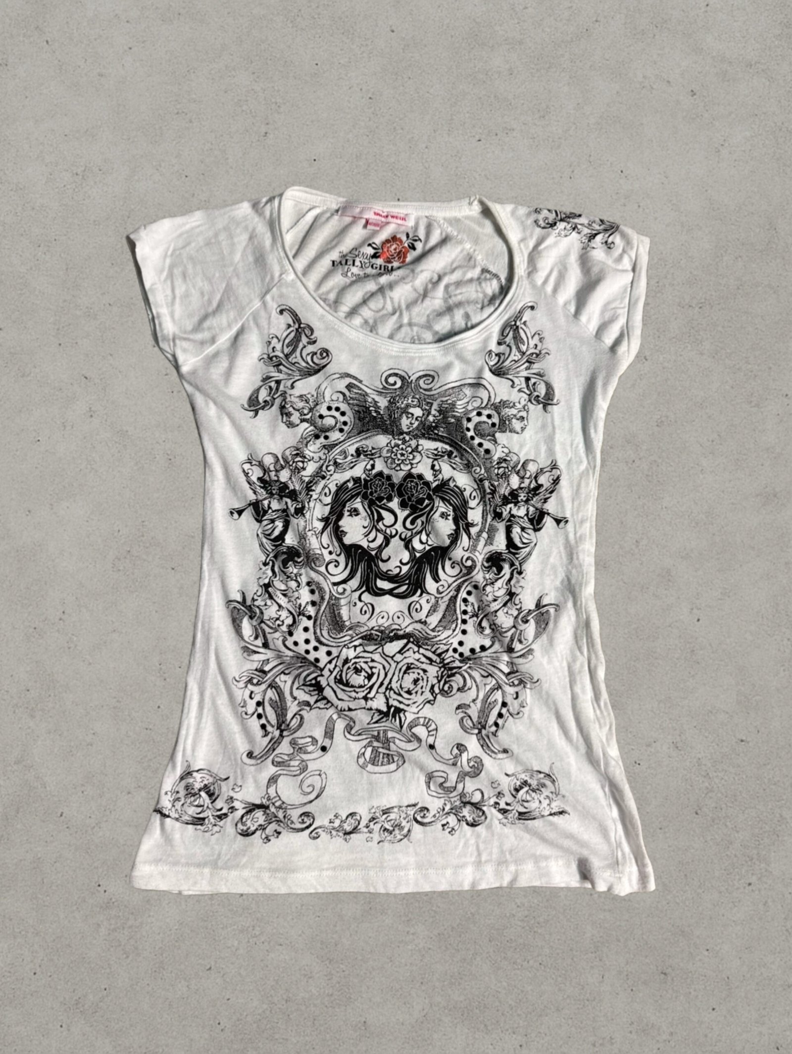 T-shirt z tatuażowym printem w klimacie Y2K fairycore z ciemnym twistem. W vibe’ie Affliction style – odważny, edgy i mega charakterystyczny. Idealny do spódnicy z klamrą albo lowrise jeansów.